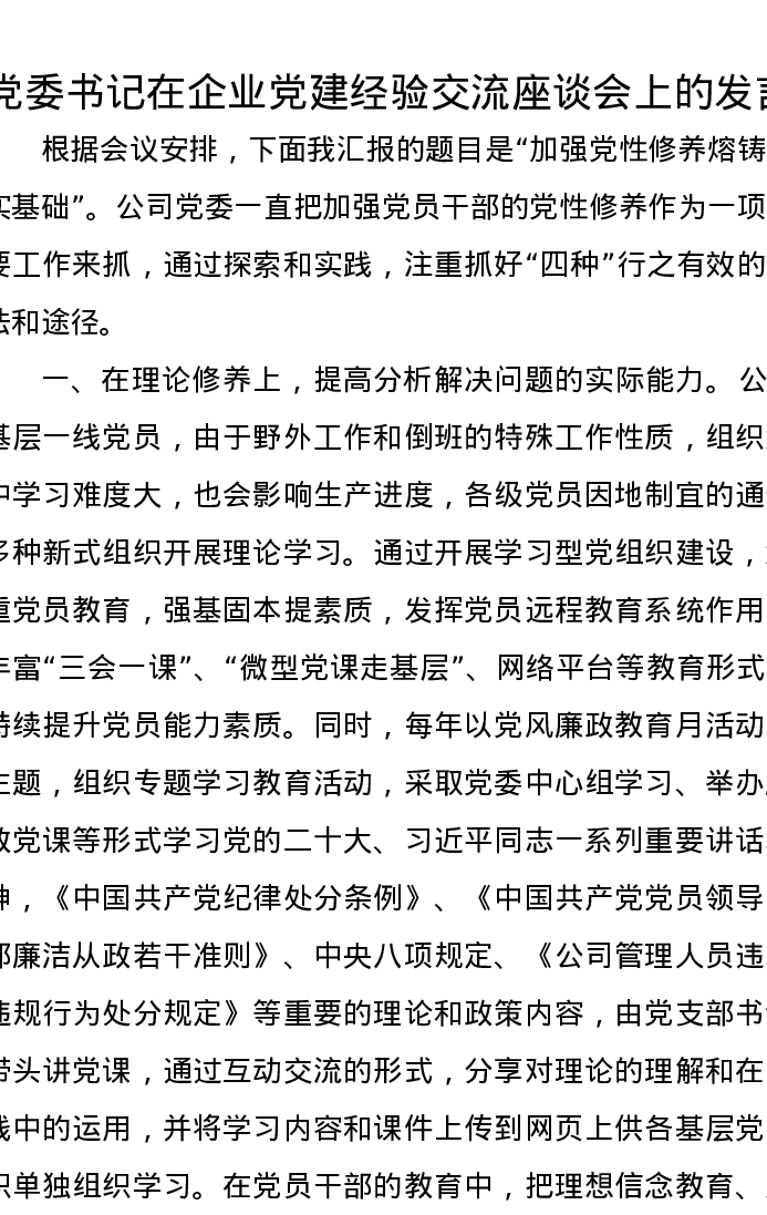 党委书记在企业党建经验交流座谈会上的发言