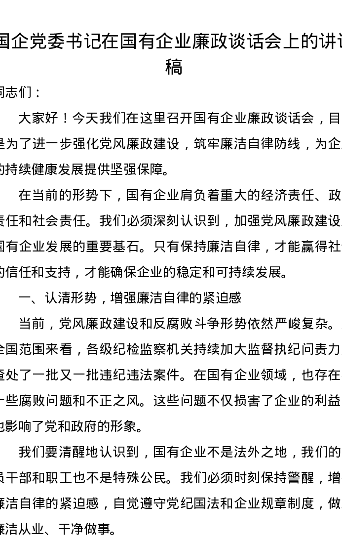 国企党委书记在国有企业廉政谈话会上的讲话稿