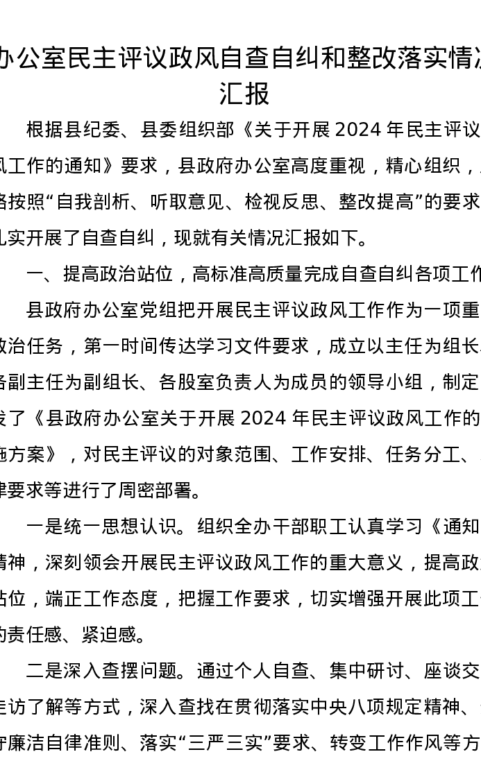 办公室民主评议政风自查自纠和整改落实情况汇报