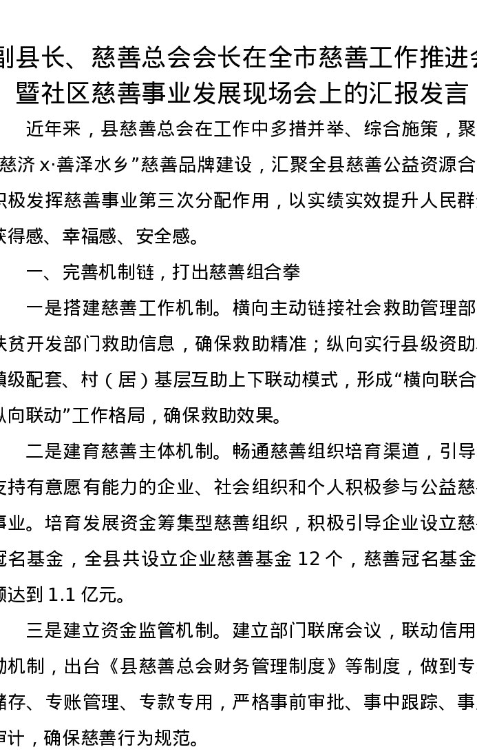 副县长、慈善总会会长在全市慈善工作推进会暨社区慈善事业发展现场会上的汇报发言