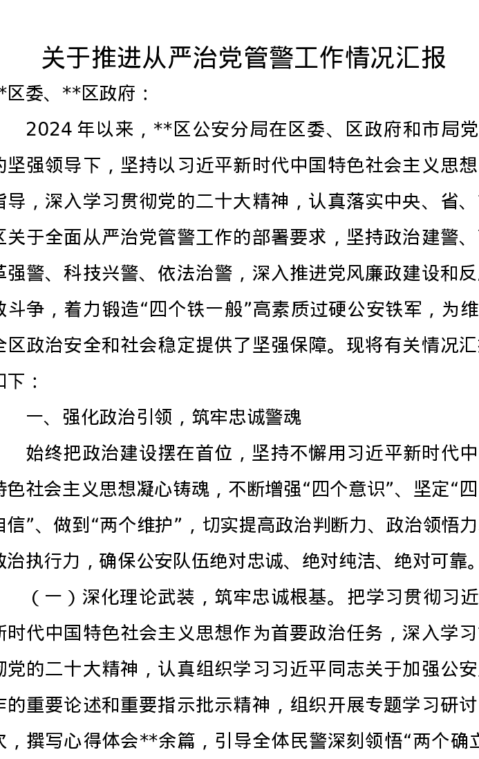 关于推进从严治党管警工作情况汇报