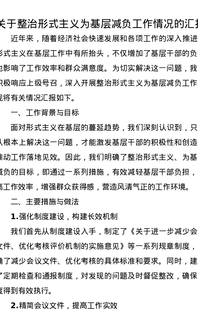 关于整治形式主义为基层减负工作情况的汇报