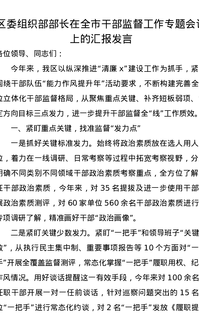 区委组织部部长在全市干部监督工作专题会议上的汇报发言