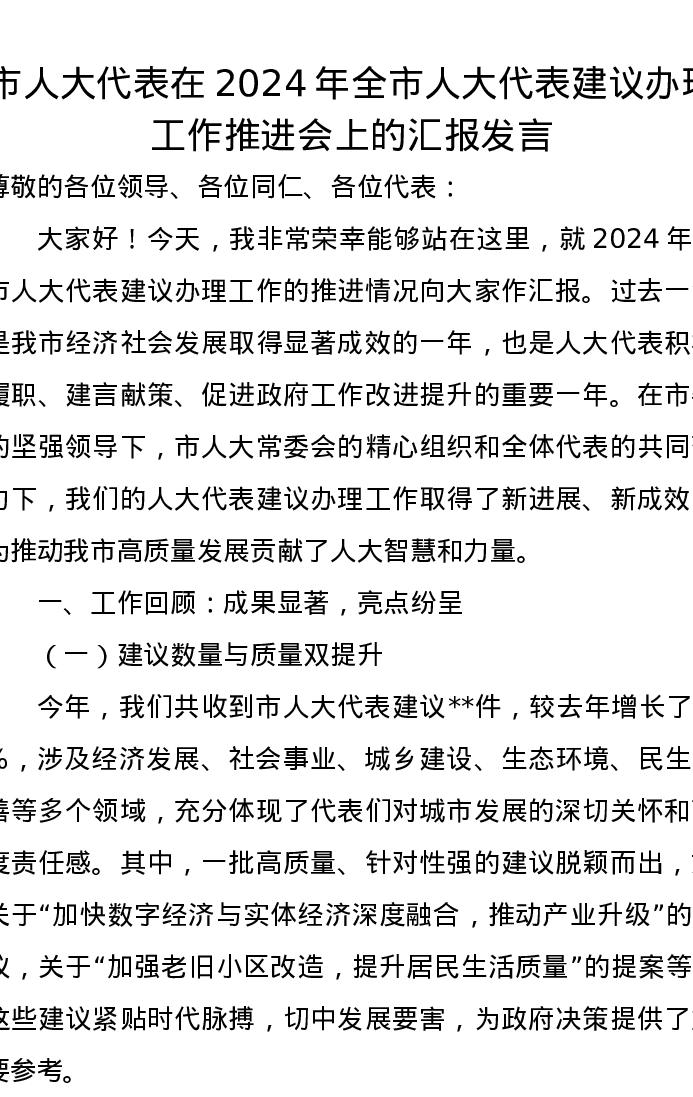 市人大代表在2024年全市人大代表建议办理工作推进会上的汇报发言
