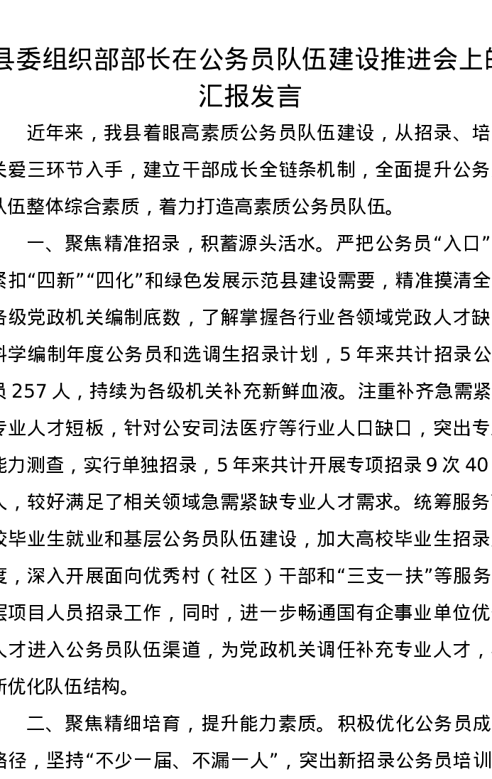 县委组织部部长在公务员队伍建设推进会上的汇报发言
