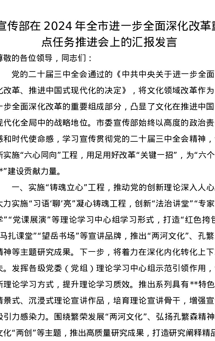 宣传部在2024年全市进一步全面深化改革重点任务推进会上的汇报发言