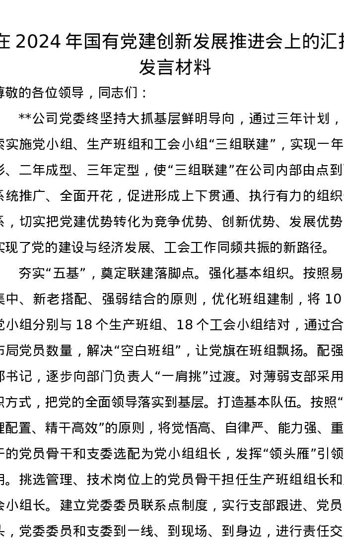 在2024年国有党建创新发展推进会上的汇报发言材料