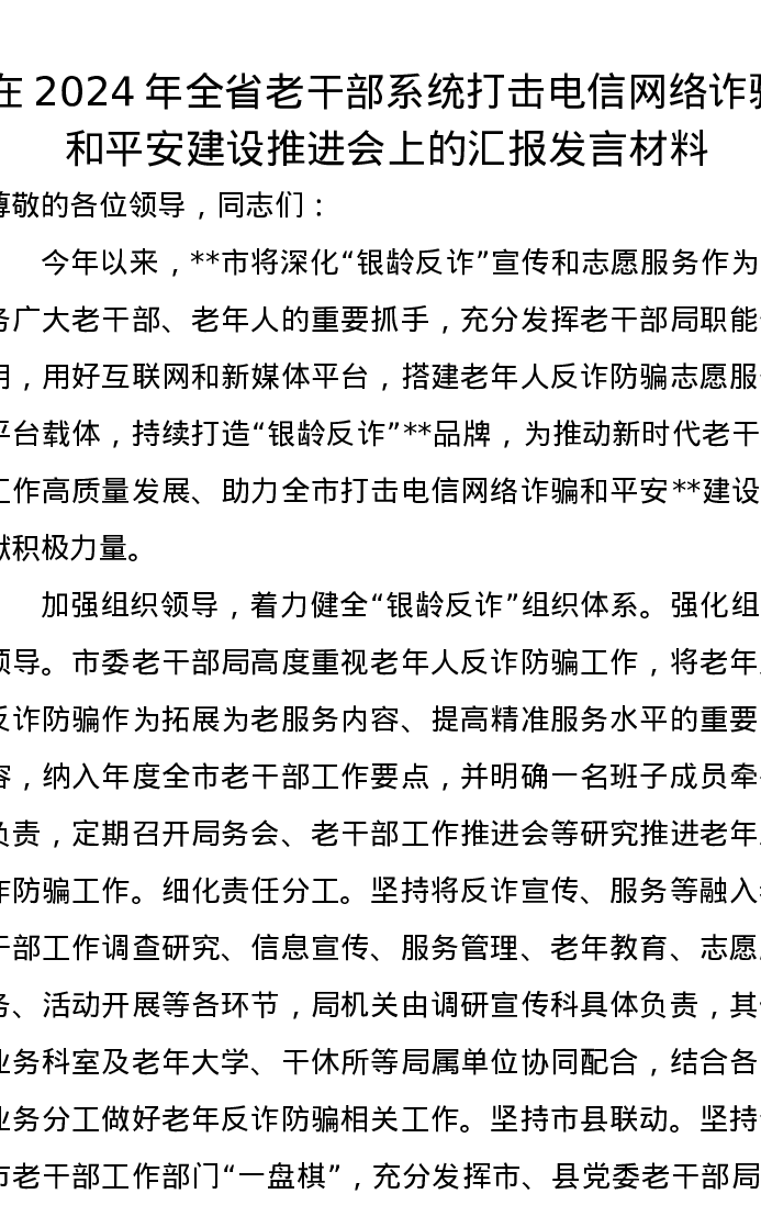 在2024年全省老干部系统打击电信网络诈骗和平安建设推进会上的汇报发言材料