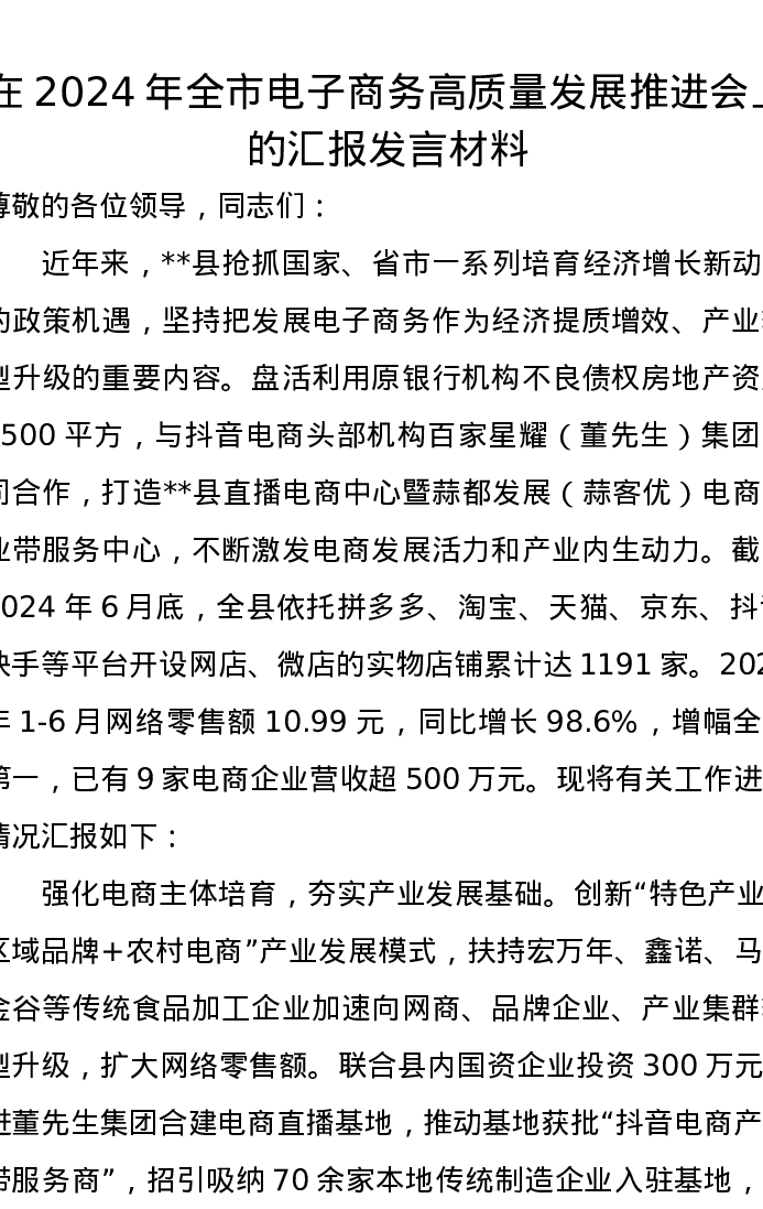 在2024年全市电子商务高质量发展推进会上的汇报发言材料