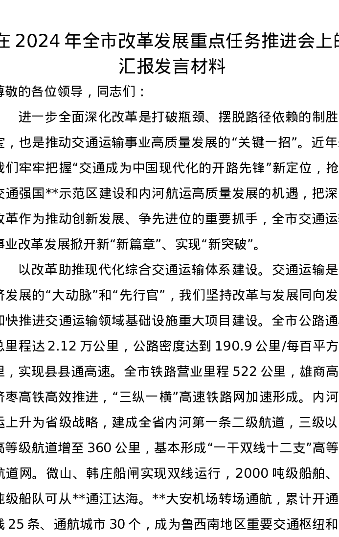 在2024年全市改革发展重点任务推进会上的汇报发言材料