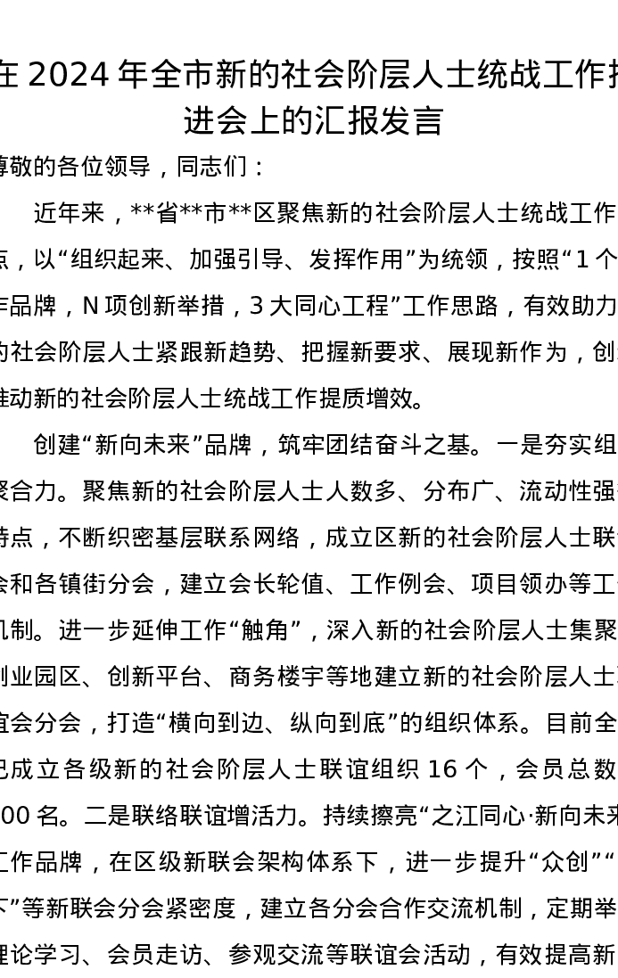在2024年全市新的社会阶层人士统战工作推进会上的汇报发言