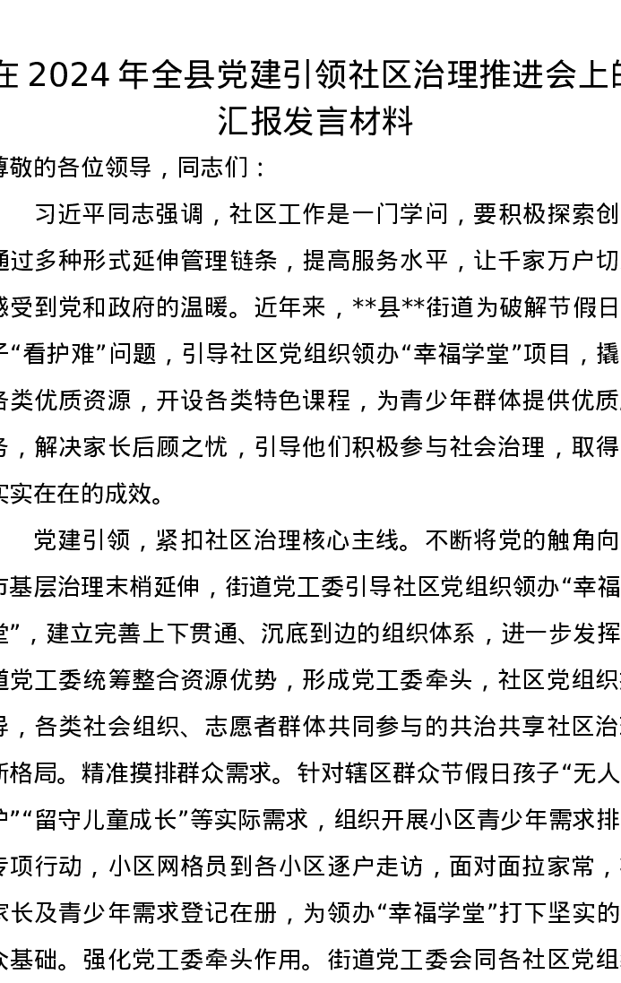 在2024年全县党建引领社区治理推进会上的汇报发言材料
