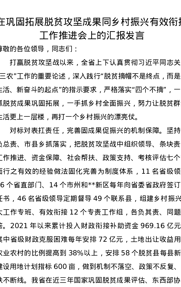 在巩固拓展脱贫攻坚成果同乡村振兴有效衔接工作推进会上的汇报发言