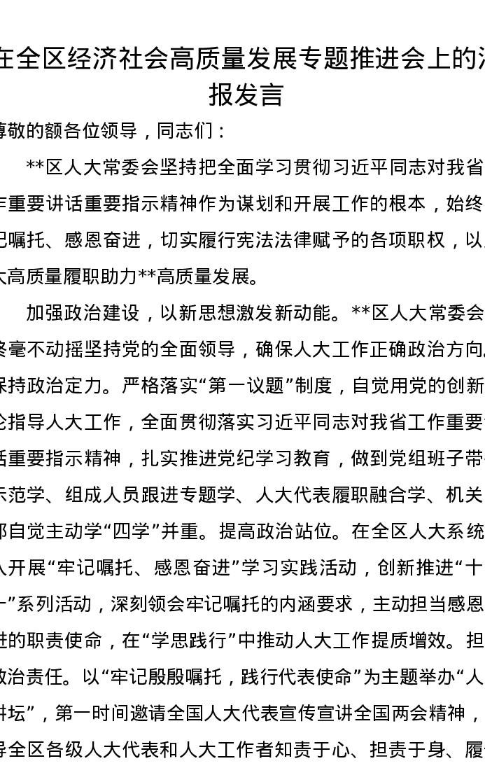 在全区经济社会高质量发展专题推进会上的汇报发言