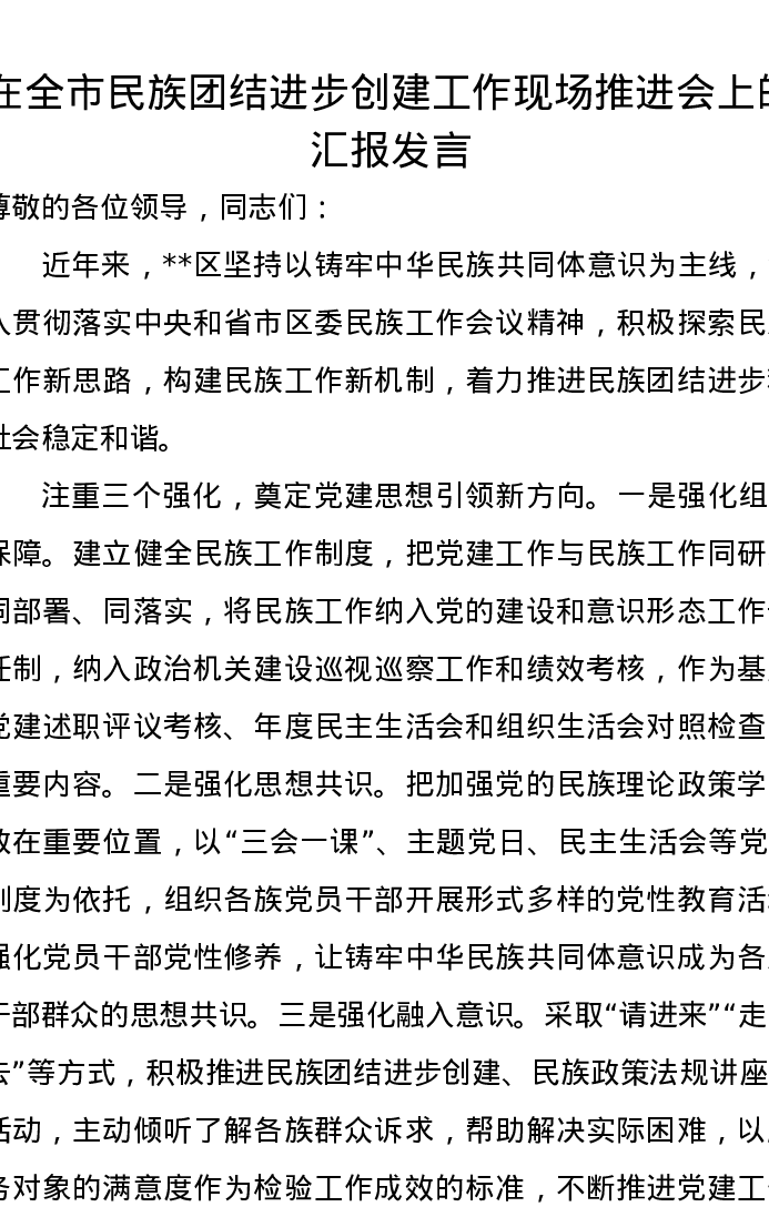 在全市民族团结进步创建工作现场推进会上的汇报发言