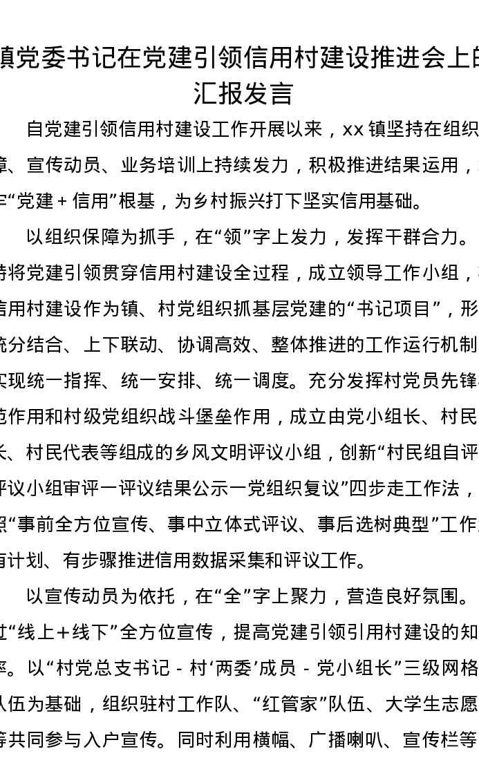 镇党委书记在党建引领信用村建设推进会上的汇报发言