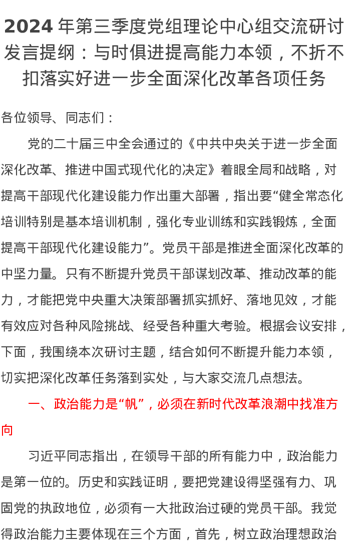 2024年第三季度党组理论中心组交流研讨发言提纲:与时俱进提高能力本领,不折不扣落实好进一步全面深化改革各项任务