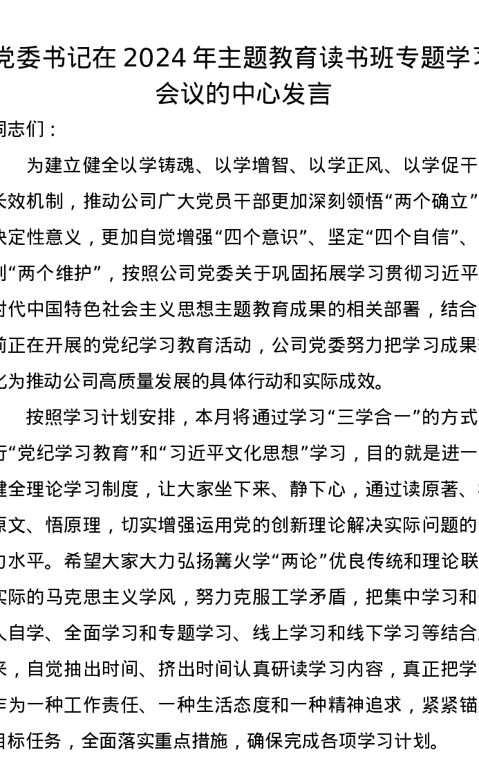 党委书记在2024年主题教育读书班专题学习会议的中心发言