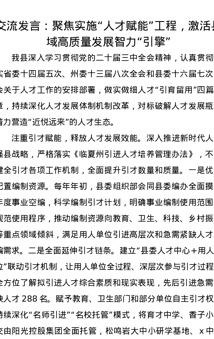 交流发言:聚焦实施“人才赋能”工程,激活县域高质量发展智力“引擎”