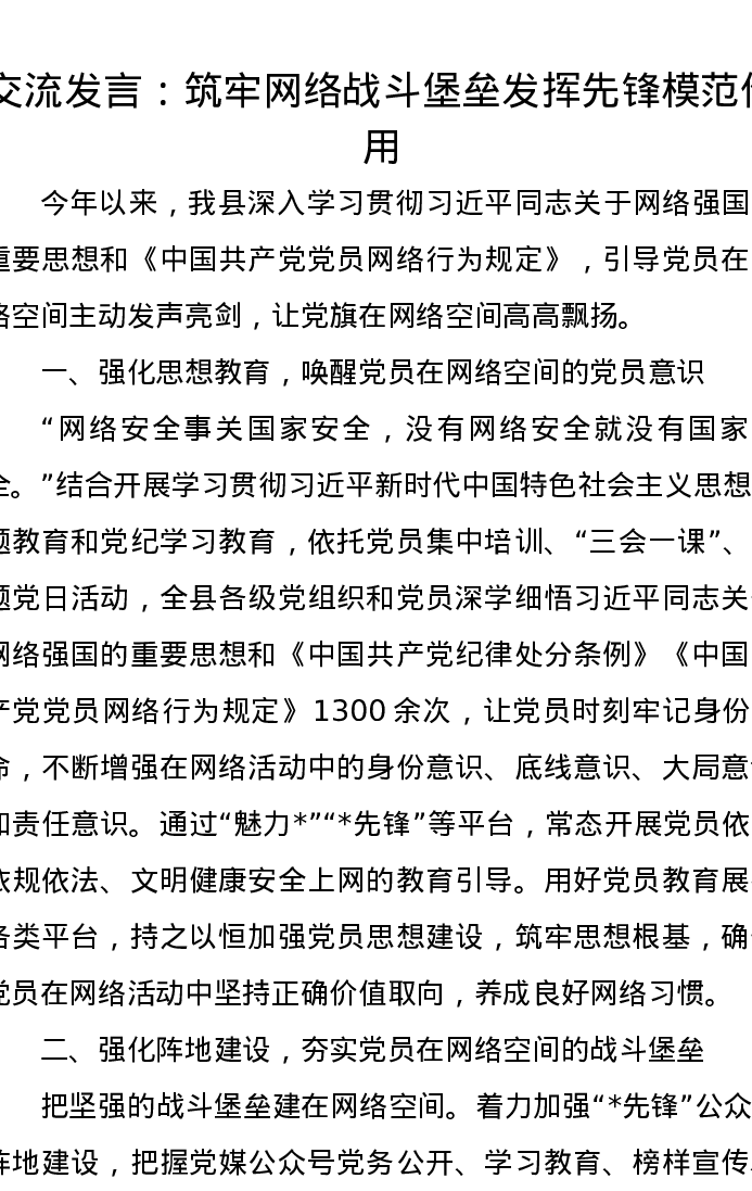 交流发言:筑牢网络战斗堡垒发挥先锋模范作用