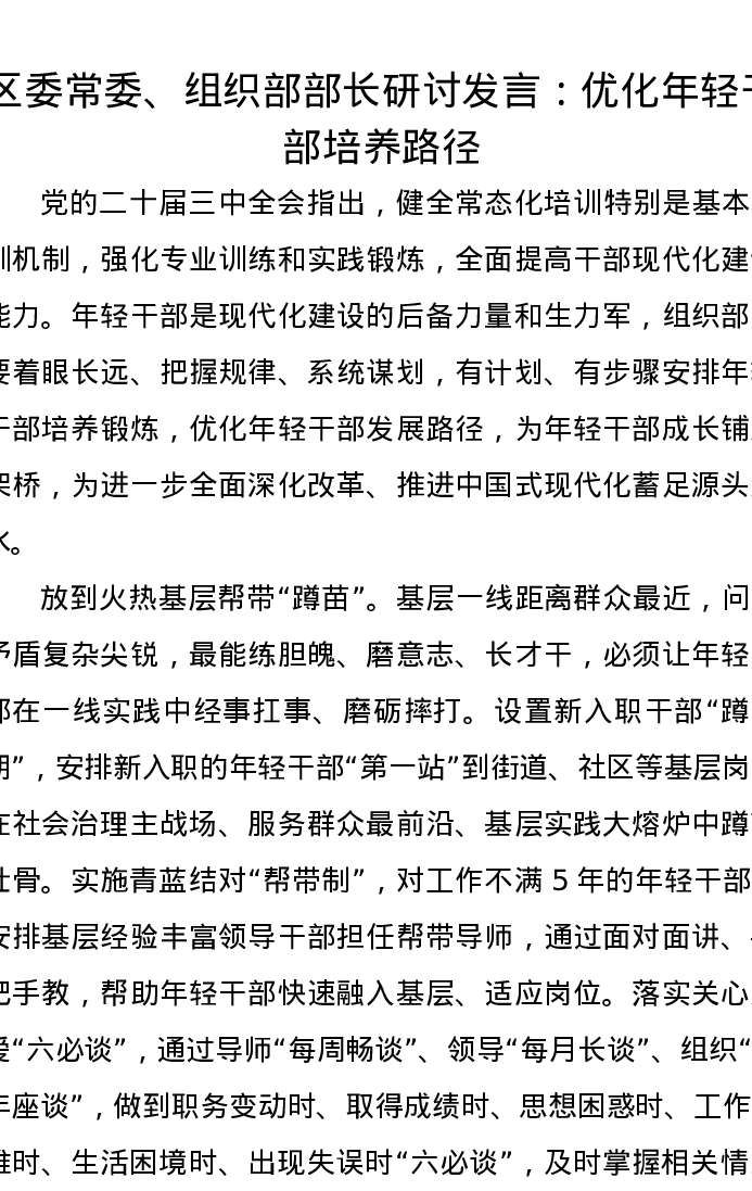 区委常委、组织部部长研讨发言:优化年轻干部培养路径