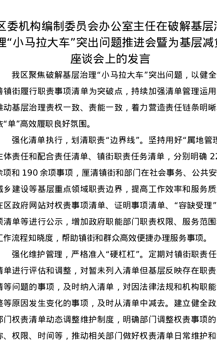 区委机构编制委员会办公室主任在破解基层治理“小马拉大车”突出问题推进会暨为基层减负座谈会上的发言