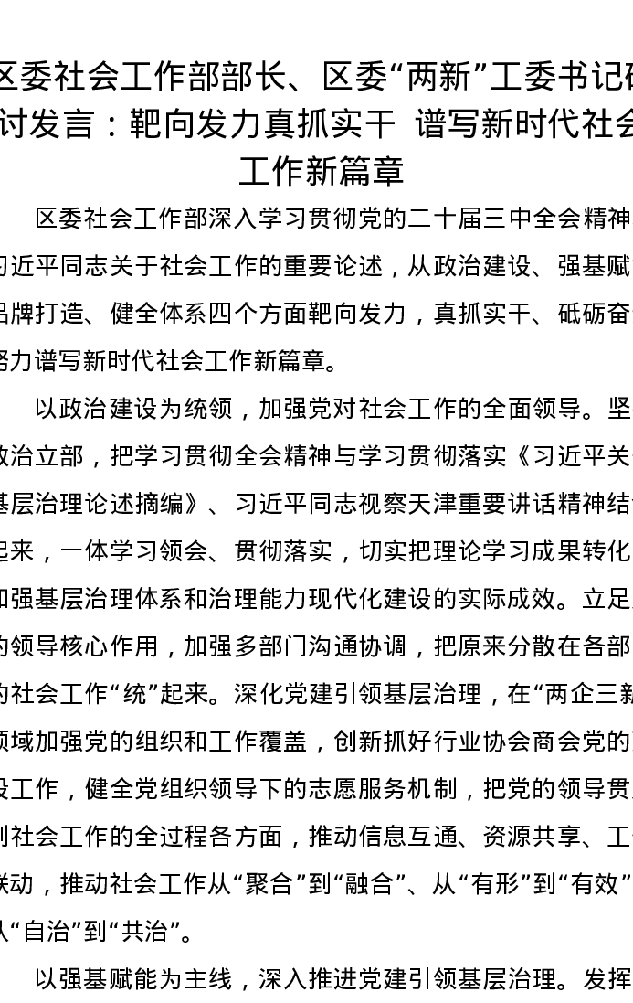 区委社会工作部部长、区委“两新”工委书记研讨发言:靶向发力真抓实干谱写新时代社会工作新篇章