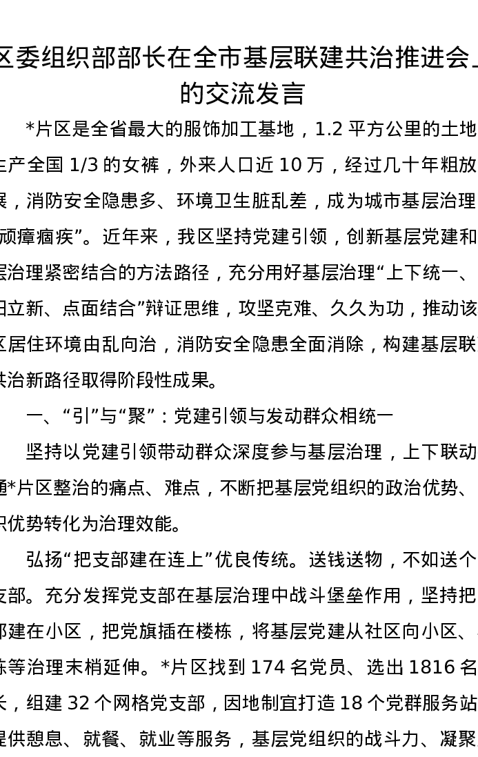 区委组织部部长在全市基层联建共治推进会上的交流发言