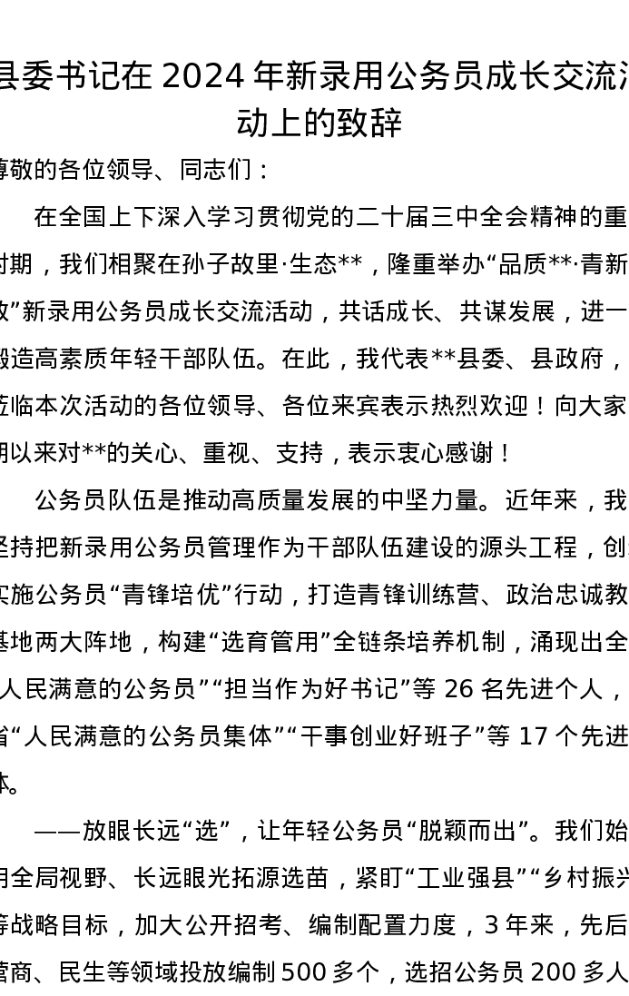 县委书记在2024年新录用公务员成长交流活动上的致辞