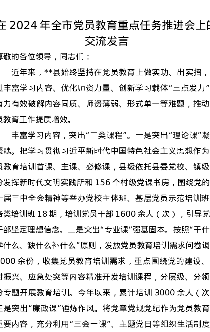 在2024年全市党员教育重点任务推进会上的交流发言
