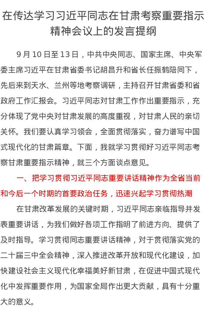 在传达学习习近平总书记在甘肃考察重要指示精神会议上的发言提纲