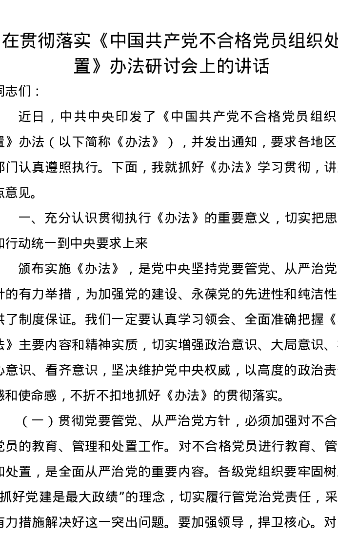 在贯彻落实《中国共产党不合格党员组织处置》办法研讨会上的讲话