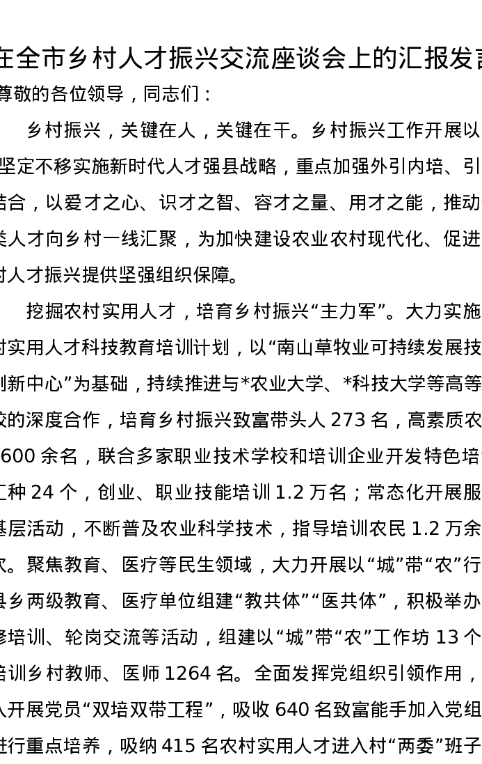 在全市乡村人才振兴交流座谈会上的汇报发言
