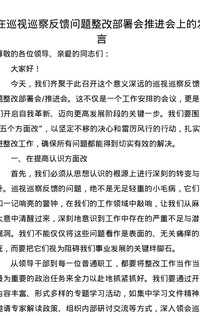 在巡视巡察反馈问题整改部署会推进会上的发言