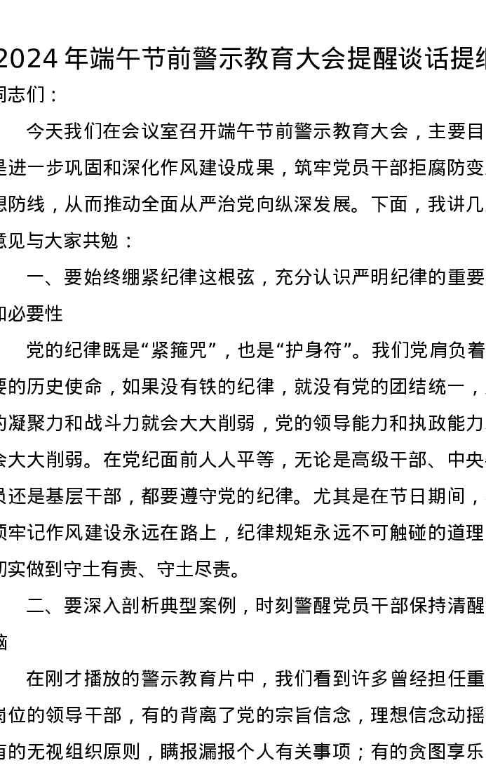 2024年端午节前警示教育大会提醒谈话提纲