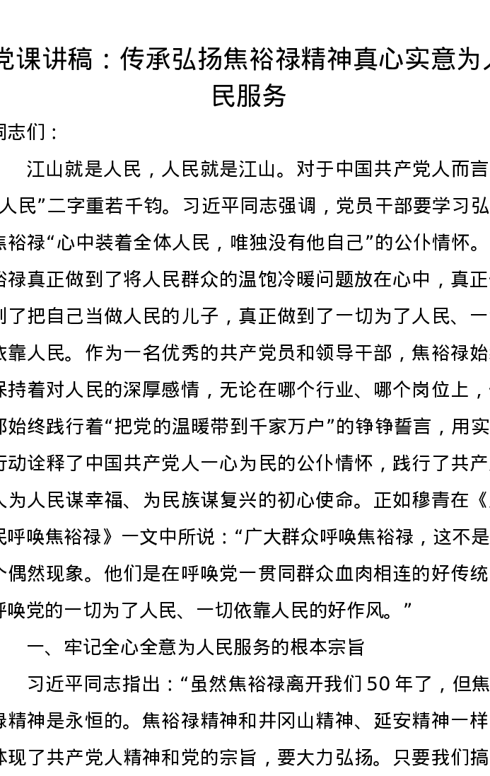 党课讲稿:传承弘扬焦裕禄精神真心实意为人民服务