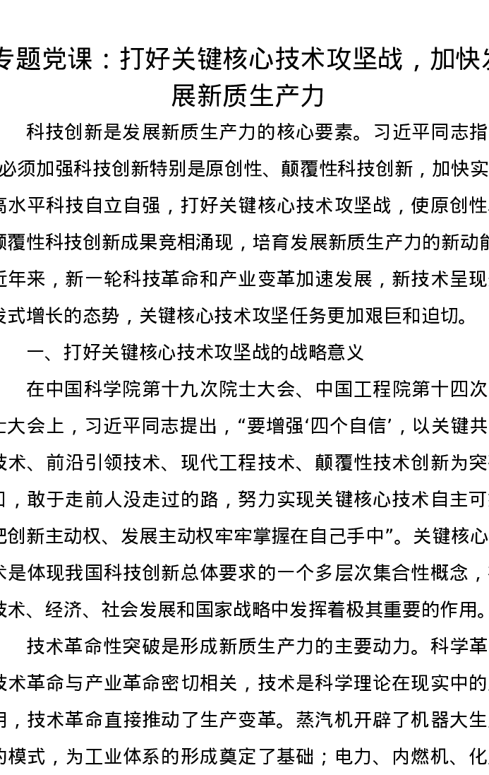 党课讲稿:打好关键核心技术攻坚战,加快发展新质生产力
