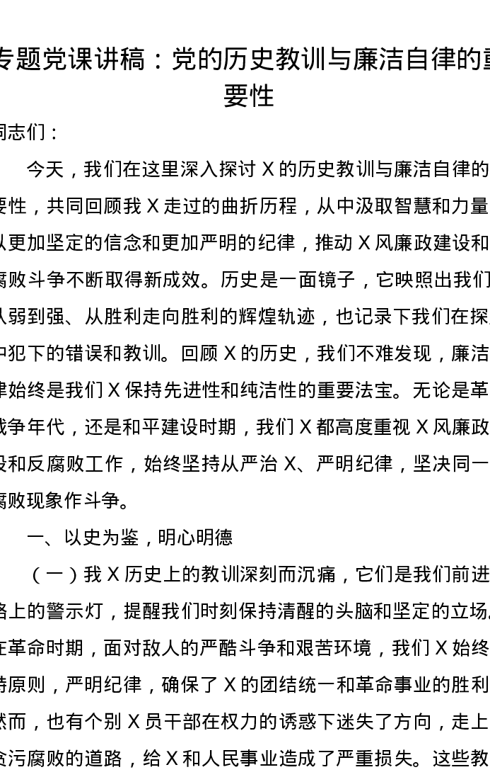 党课讲稿:党的历史教训与廉洁自律的重要性