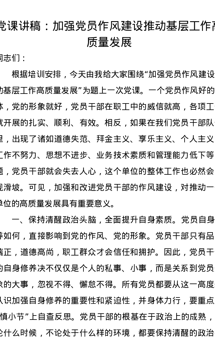 党课讲稿:加强党员作风建设推动基层工作高质量发展