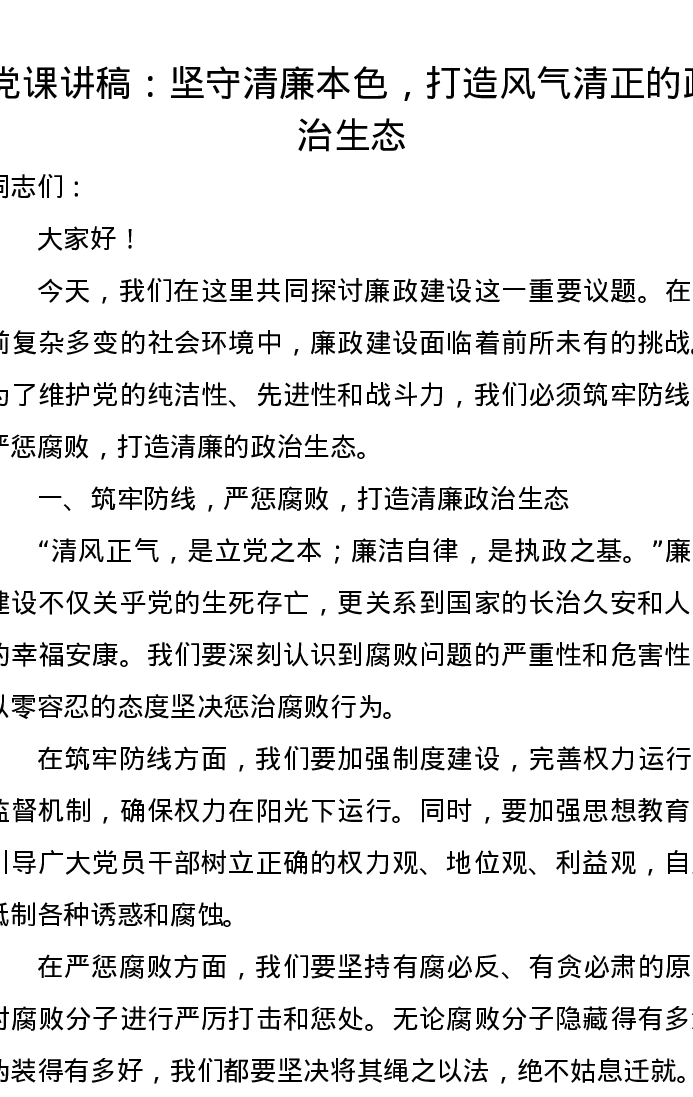 党课讲稿:坚守清廉本色,打造风气清正的政治生态