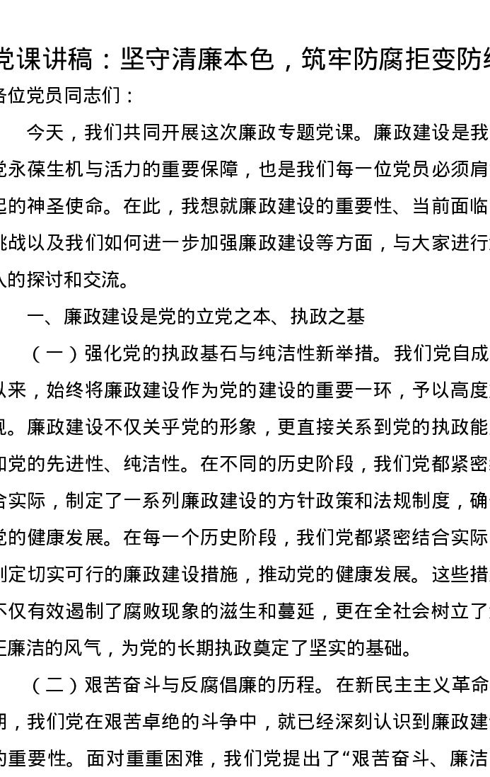 党课讲稿:坚守清廉本色,筑牢防腐拒变防线