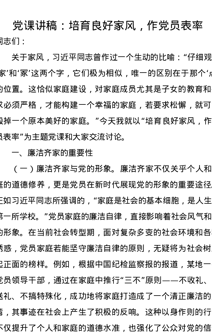 党课讲稿:培育良好家风,作党员表率