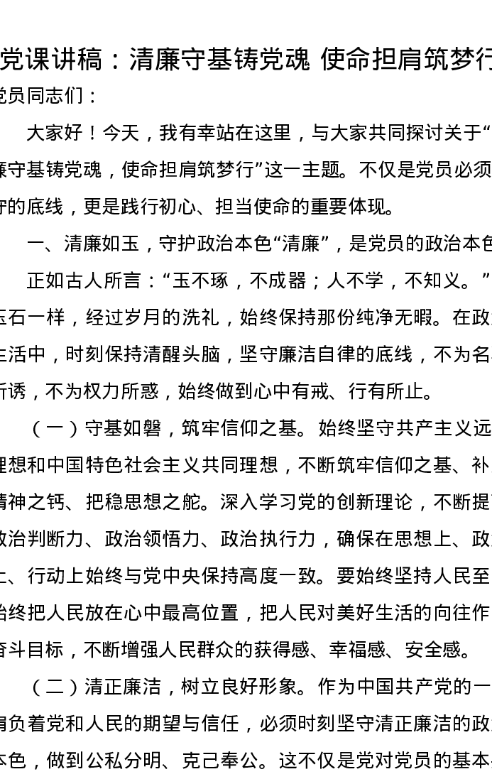 党课讲稿:清廉守基铸党魂使命担肩筑梦行