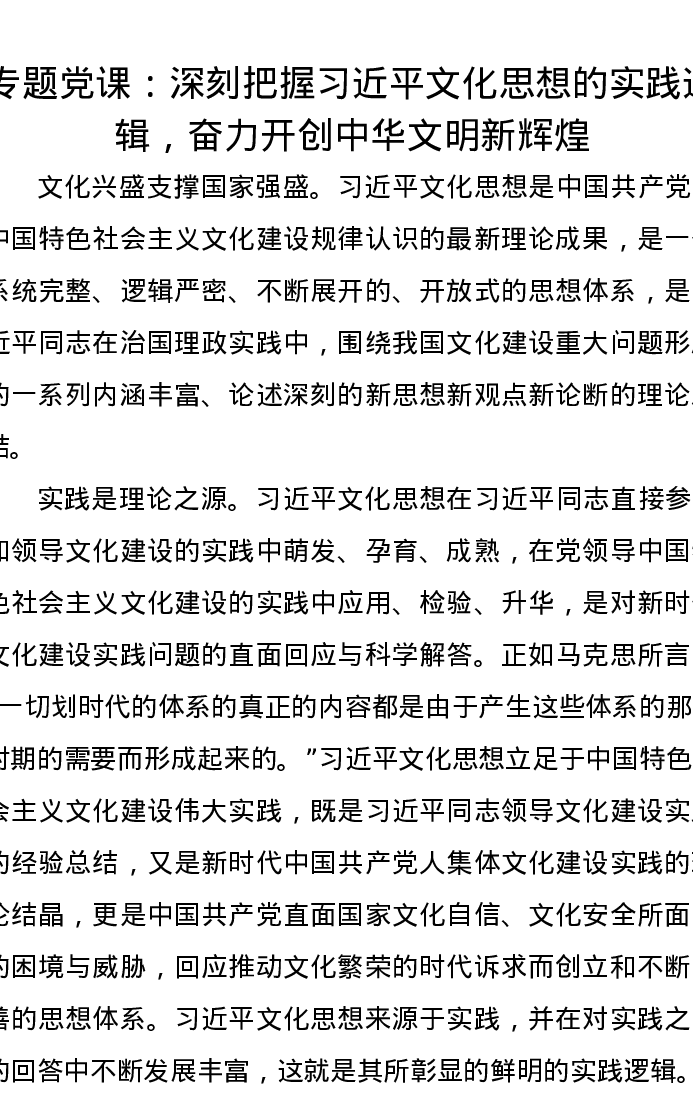 党课讲稿:深刻把握习近平文化思想的实践逻辑,奋力开创中华文明新辉煌