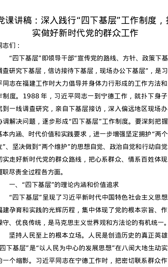 党课讲稿:深入践行“四下基层”工作制度,扎实做好新时代党的群众工作