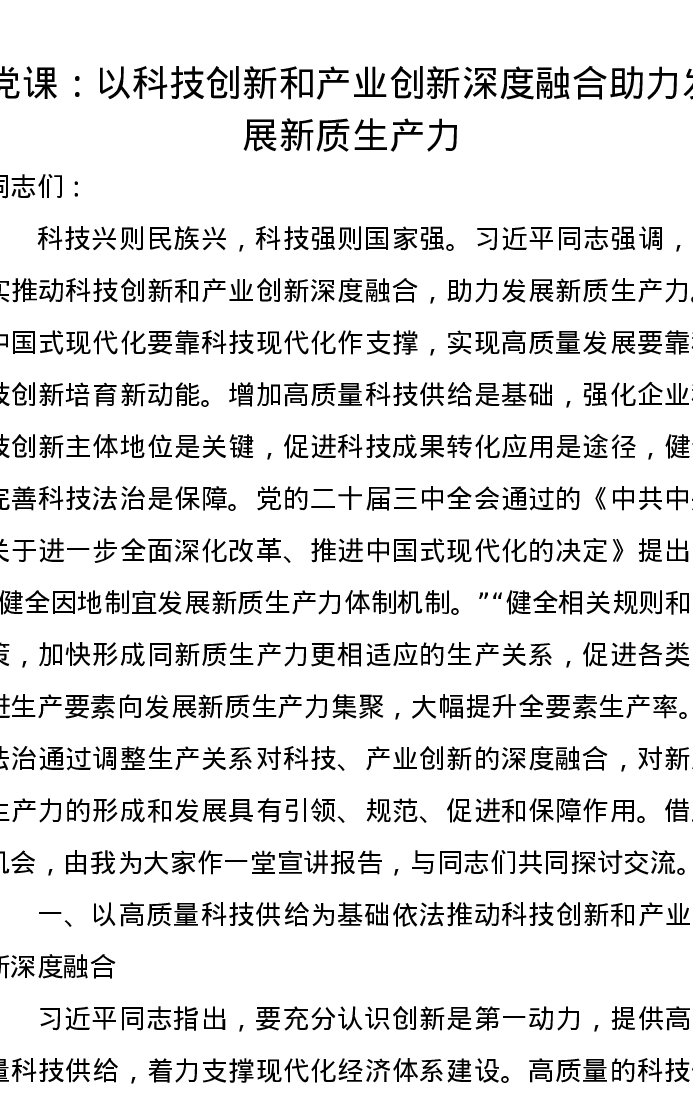 党课讲稿:以科技创新和产业创新深度融合助力发展新质生产力