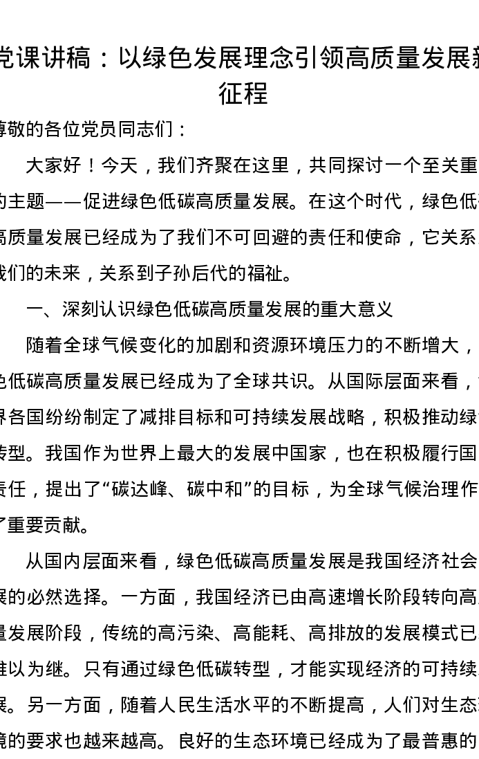 党课讲稿:以绿色发展理念引领高质量发展新征程
