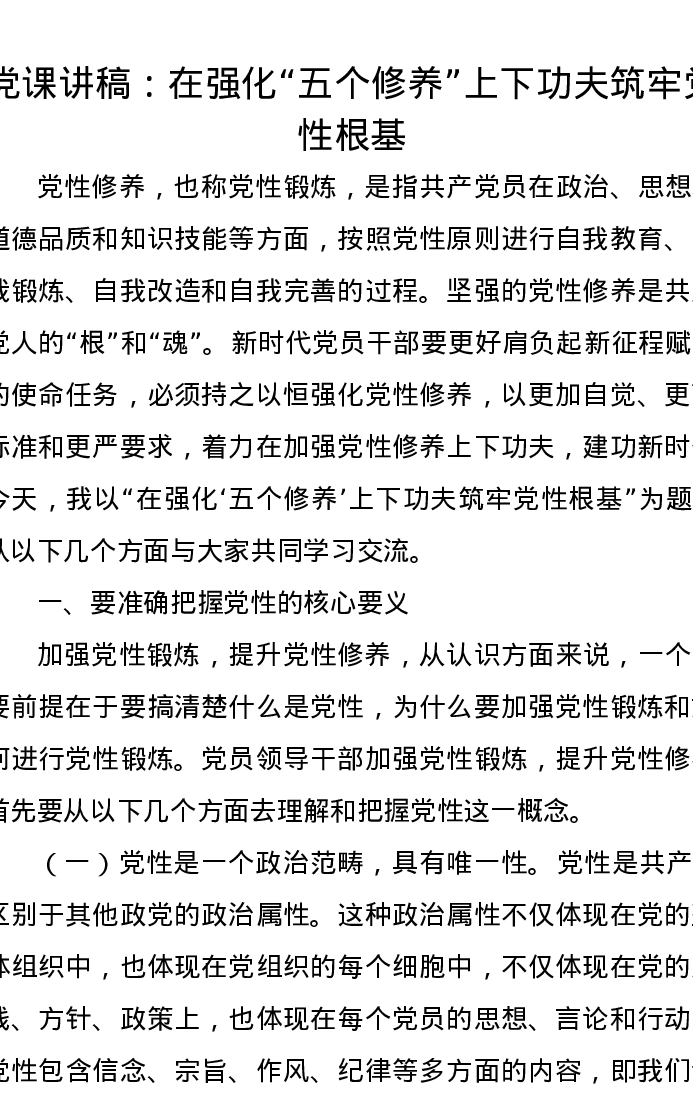 党课讲稿:在强化“五个修养”上下功夫筑牢党性根基
