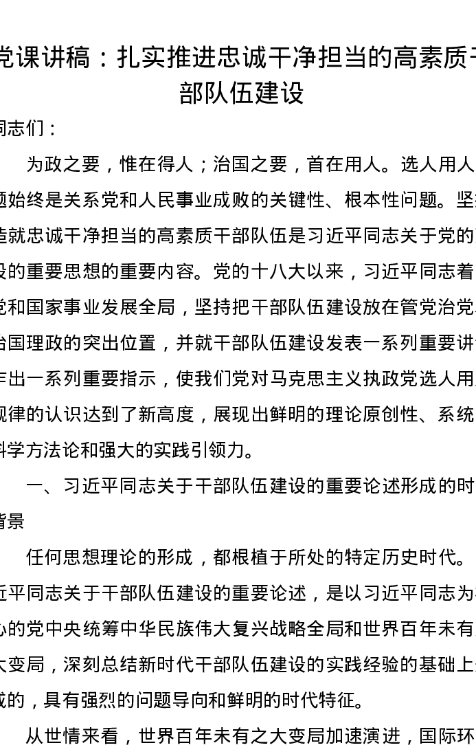 党课讲稿:扎实推进忠诚干净担当的高素质干部队伍建设