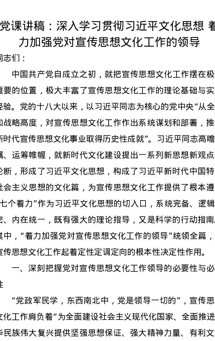 党课讲稿:着力加强党对宣传思想文化工作的领导